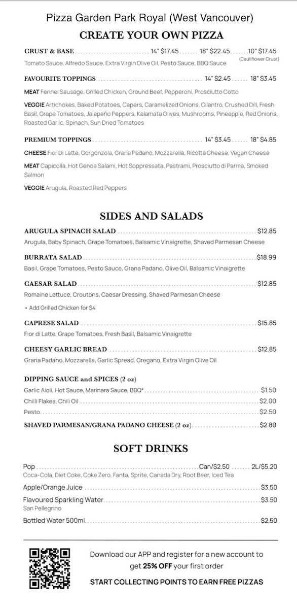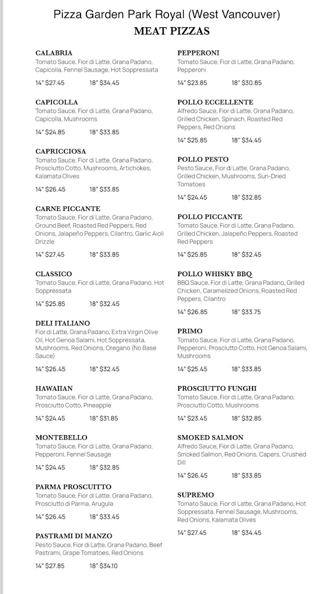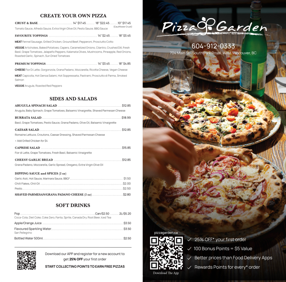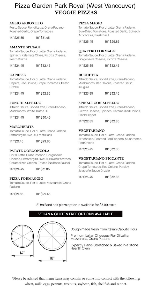 The menu at Pizza Garden in West Vancouver offers a delightful variety of options that cater to diverse tastes. For vegetarians, standout choices include the Aglio Arrostito X-Large 18" for $18, the Amante Spinaci Medium 14" for $14, and the spicy Vegetariano Piccante Medium 14" for $14. If you're in the mood to personalize your pizza, the Create Your Own Pizza options are available in both Large 18" for $18 and Medium 14" for $14, with the flexibility of a Half & Half Pizza. Meat lovers can indulge in the Hawaiian X-Large 18" for $18, the flavorful Primo X-Large 18" for $18, or the savory Prosciutto Funghi X-Large 18" for $18. For something lighter, the Arugula Spinach Salad, Caesar Salad, and Caprese Salad provide fresh alternatives. Vegans can enjoy options like the Vegetariano in both Medium 14" for $14 and X-Large 18" for $18, crafted without animal products. Sides include tempting dips such as Pesto Sauce Dip and BBQ Sauce Dip, each priced at $2 for 2 oz.. Beverage choices range from classic soft drinks like Fanta and Nestea Cool to refreshing juices. Special DashPass deals include the Calabria Pizza Combo, which offers two 18" Cheese Pizzas along with two cans for a great value. With such a wide variety, Pizza Garden ensures that there’s something for everyone to enjoy.