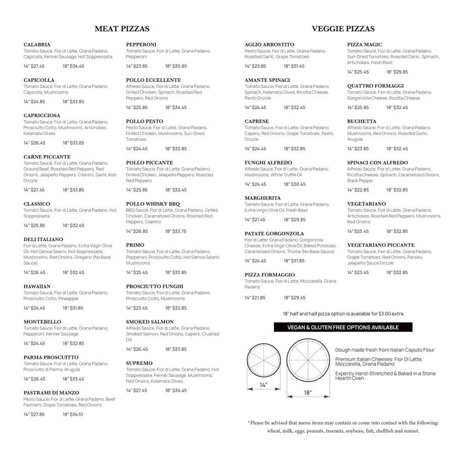 Hearty 18" pie with mozzarella, fior di latte, grana padano, genoa salami, hot soppressata, mushrooms, red onions,oregano, and olive oil.